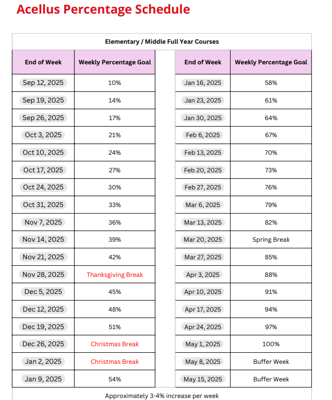 Families can use this chart to track expected weekly progress in Volt Learning.